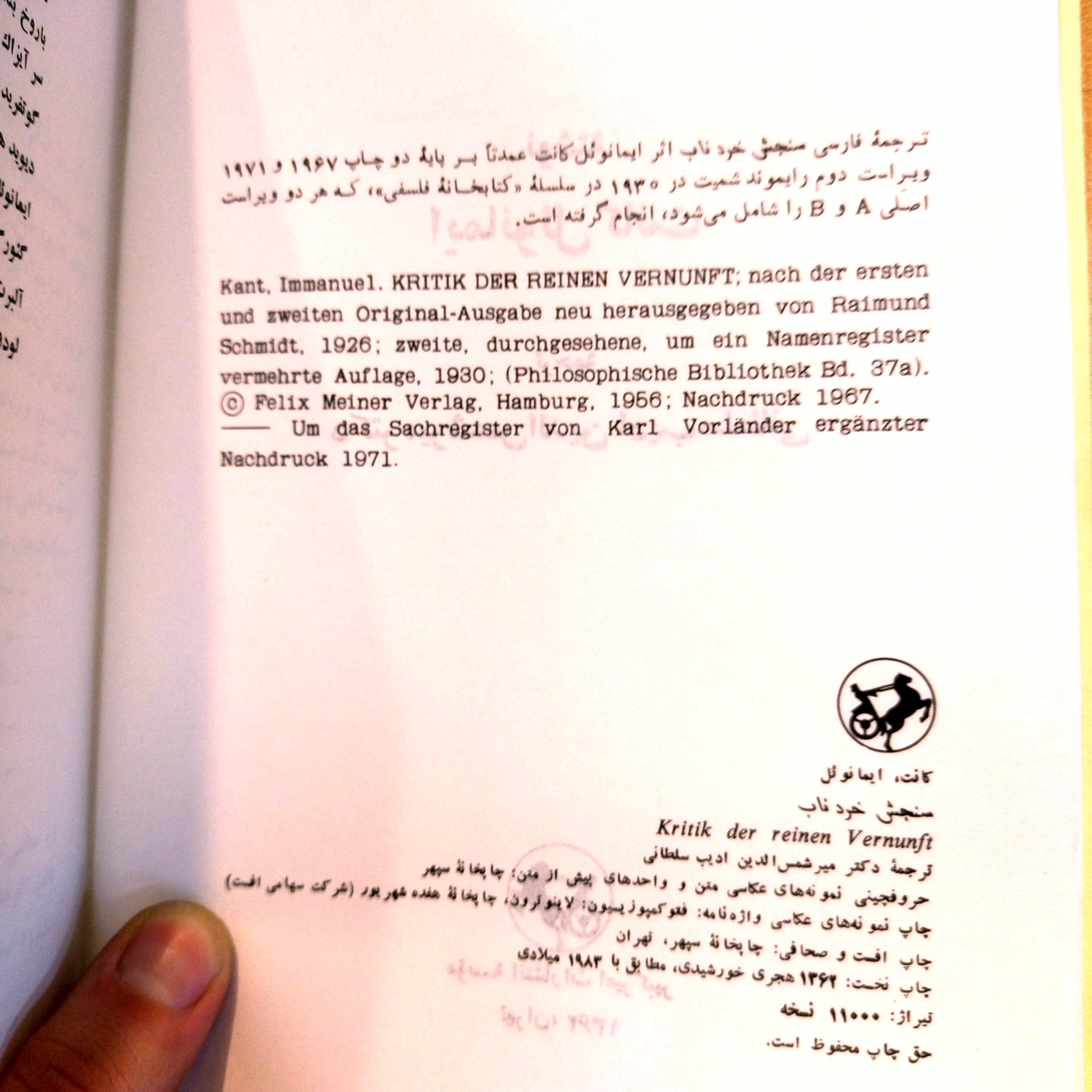 کتاب دست دوم سنجش خرد ناب اثر ایمانوئل کانت به ترجمه دکتر میر شمس الدین ادیب سلطانی (چاپ 62)